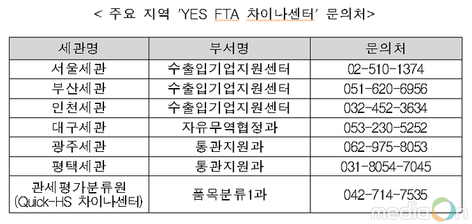 도움이 필요한 기업은 전국 34개 세관의 'YES FTA 차이나센터'에 문의하면 된다.