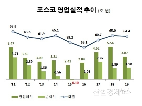 포스코가 시장에 공시한 2019년 연간 잠정 연결실적을 살펴보면, 매출은 64조3668억원, 영업이익은 3조8689억원, 순이익은 1조9826억원을 실현했다.