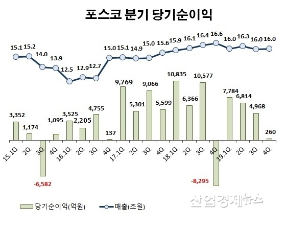 또, 당기순이익은 260억원을 실현해서 사실상 이익이 거의 나지 않은 모습이다. 포스코는 2018년 4분기에도 영업이익은 1조2715억원 흑자를 냈지만 당기순이익은 8295억원 적자를 내는 등 유독 4분기에 당기순이익이 저조한 모습을 보이고 있다.