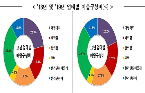 또한 온오프라인 유통채널별 판매액도 백화점, 할인점, 편의점 등 오프라인(0.9%↓)은 소폭 감소했으나, 온라인(14.2%↑)이 크게 증가해 전반적인 성장세를 유지했다. 이로써 업태별 시장 판매점유율도 온라인판매중개 업체들이 2018년 26.8%에서 지난해 29.7%로 2.9%P 증가했고 온라인판매사들도 11.0%에서 11.5%로 0.5%P 늘어난 것으로 집계됐다.