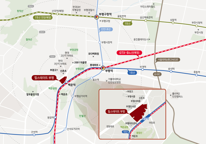 특히 힐스테이트 부평이 위치한 백운2구역은 백운역과 접하고 있어 일대 정비사업장 중 입지가 가장 우수한 곳으로 꼽힌다. 백운역에서 지하철 이용시 서울 여의도, 용산, 서울역까지 50분대에 갈 수 있으며, 한 정거장 떨어진 부평역에서 급행으로 환승시 시간이 더 단축된다. 단지에서 송도를 잇는 부평삼거리역(인천지하철 1호선) 이용도 수월하다.