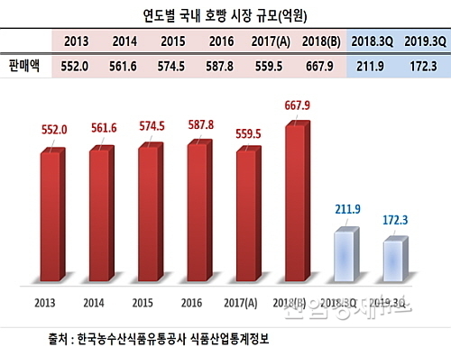 지난 13일 발표한 한국농수산식품유통공사(aT)의 식품산업통계정보에 따르면 국내 호빵 소매시장 규모는 2013년 552.0억 원에서 2014년 561.6억, 2015년 574.5억 2016년 587.8억으로 소폭 성장세를 견지하다가 2017년 559.5억 원으로 감소해 처음으로 성장세가 꺾였다.