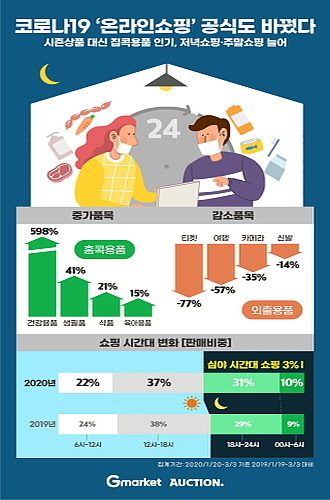 온라인 유통기업 1위 이베이코리아가 국내 첫 코로나19 확진자 발표가 있었던 지난 1월 20일부터 3월 3일까지 G마켓과 옥션의 판매 빅데이터를 작년 동기간(2019/1/19-3/3)과 비교 분석한 결과, 상품군 및 쇼핑 시간대 등에 변화 추이를 보였다고 밝힌 것.