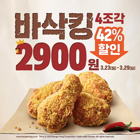 이에 라이벌 버거킹도 지난 23일부터 일주일간 대표 메뉴인 와퍼와 불고기 와퍼 단품을 정상가 대비 약 40% 할인된 3500원에, 또 24일부터는 인기 사이드 메뉴인 ‘바삭킹’ 4조각을 오는 29일까지 정가 대비 42% 할인한 2900원에 판매하는 프로모션도 선보였다.