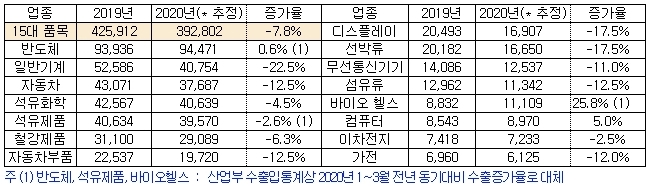 기계, 자동차, 선박 등의 수출이 크게 감소할 것으로 예상되지만, 전체 수출에서 가장 큰 비중을 차지하는 반도체가 미미하나마 증가세를 보이고, 코로나19로 인해 의약품 수출이 크게 증가하면서 감소폭이 줄어 들 것으로 예상된다.