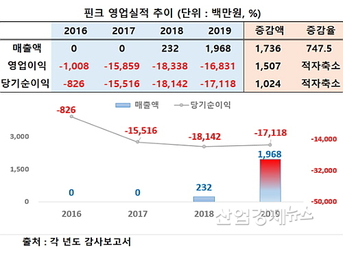 핀크의 설립 첫 해인 2016년부터 지난해까지의 영업실적을 감사보고서에 의거해 살펴보면 먼저 매출은 2017년까지 한 푼도 없다가 2018년 2.3억, 지난해는 약 19.7억 원을 올리는데 그쳤다.
