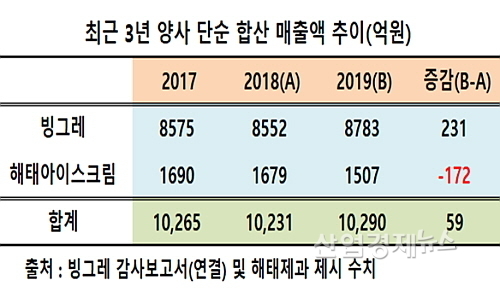 업계 관계자는 “해태아이스크림의 최근 매출이 지속적으로 감소하고 있는데다 한울회계법인 분석에 따르면 영업 손익이 2016년 –54.7억, 2018년 –35.2억, 2019년 –30.1억 등 적자상태를 면치 못하고 있어, 당분간 빙그레 전체 수익성에 부정적 영향을 줄 것”으로 지적했다.
