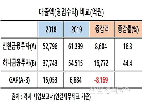 각사 사업보고서에 따르면 먼저 연결매출(영업수익)의 경우 신한금융투자가 2018년 대비 16.3% 신장한 6조1399억 원을 시현한 반면, 하나금융투자는 전년 대비 약 44.4% 증가한 5조4515억 원의 매출을 기록, 외형 증가율면에서 신한금융투자 보다 약 2.7배나 앞섰다.