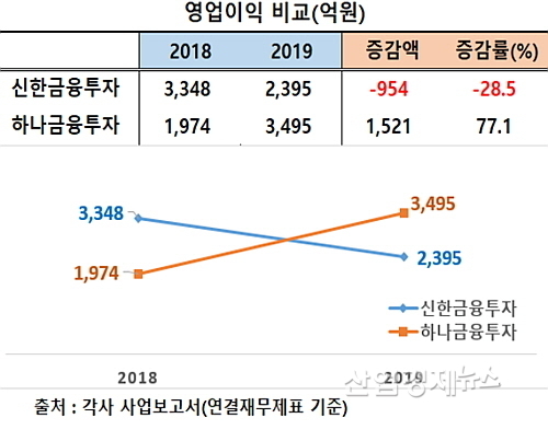 신한금융투자의 지난해 영업이익은 2395억으로 전년도 3348억 원보다 28.5% 가량 감소한 반면에 하나금융투자는 2018년도 1974억 대비 77.1%나 급증한 3495억 원의 영업이익을 시현, 증가율은 물론 절대규모면에서도 신한금융투자를 압도하는 호 성적을 대내외에 과시했다.