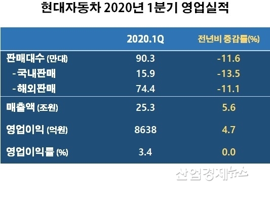 현대자동차는 지난달 2020년 1분기 실적을 발표하면서 판매 90만3371대, 매출액 25조3194억원(자동차 19조5547억원, 금융 및 기타 5조7647억원), 영업이익 8638억원, 경상이익 7243억원, 당기순이익 5527억원을 실현했다고 밝혔다.
