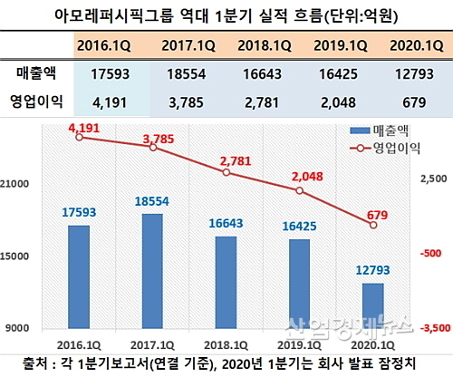 아모레퍼시픽그룹 측에서 밝힌 올 1분기 잠정실적과 각 년도 1분기 보고서에 따르면 지난 2016년부터 올 1분기까지 4년간의 연결재무제표기준 역대 1분기 실적과 비교하면 가히 충격적이다.