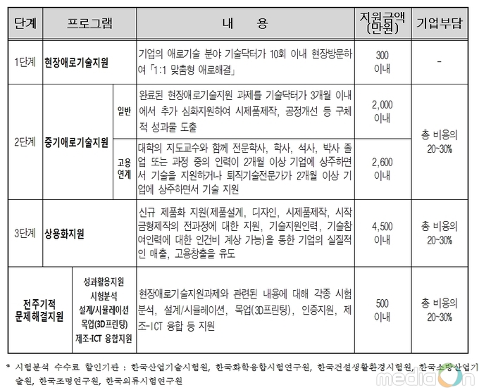 이밖에도 도는 올해 2단계로 나눠져 있는 기술닥터사업 지원프로그램을 3단계 상용화지원과, 전주기적 문제해결지원 등의 4개로 세분화해 필요한 지원을 할 예정이다. 신설된 3단계 상용화지원에는 제품설계, 디자인, 시제품제작, 기술지원인력 등이 포함된다. 기업당 4천 5백만 원 이내에서 비용지원도 이뤄지며, 총 비용의 20~30%는 기업이 부담해야 한다. 전주기적 문제해결지원은 각종 시험분석과 시뮬레이션, 인증, ICT기술지원 등을 지원하는 사업으로 기업 당 5백만 원까지 수수료와 기술을 지원한다.