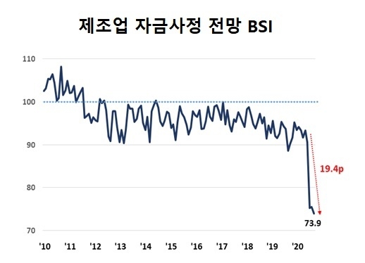 특히, 제조업의 자금사정 전망 73.9를 나타내서 글로벌 금융위기 직후인 ’09년 1월 66.4 이후 11년 만에 최저치를 기록했다.