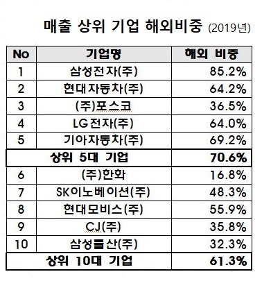 매출 상위 10대 기업은 총 매출 723.3조원 중 해외매출이 443.2조원으로 해외비중은 61.3%을 차지했다.