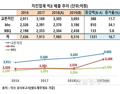 2위 bhc치킨 역시 3186억 매출을 올려 전년도 2376억 대비 810억 원이 늘어 무려 34.1%나 급증했다. 반면에 3위 BBQ는 2018년 2304억 원 대비 5.8% 늘어난 2438억 원의 매출을 올리는데 그쳐, 이들 3사 중 가장 저조했다.