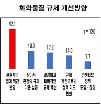 기업들이 21대 국회와 정부에 바라는 화학물질 규제 개선방향은, 가장 먼저 규제개선 시 실질적인 업계의 의견을 반영해 달라는 것이었다. 42.1%의 기업이 이렇게 요구한 것으로 조사됐다.