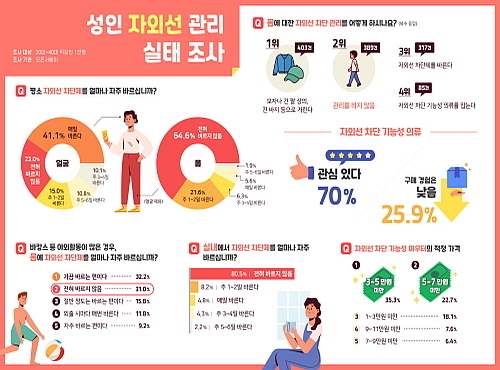 이 같은 조사 결과에 대해 의학계에서는 과도한 자외선 노출은 피부암은 물론, 백내장과 백반증 등 다양한 질병의 원인이 되기 때문에, 자외선 차단은 미용이 아닌 건강관리 차원에서 접근할 필요가 있으며, 꾸준하고 다양한 방법을 통한 관리가 필요하다고 조언하고 있다.