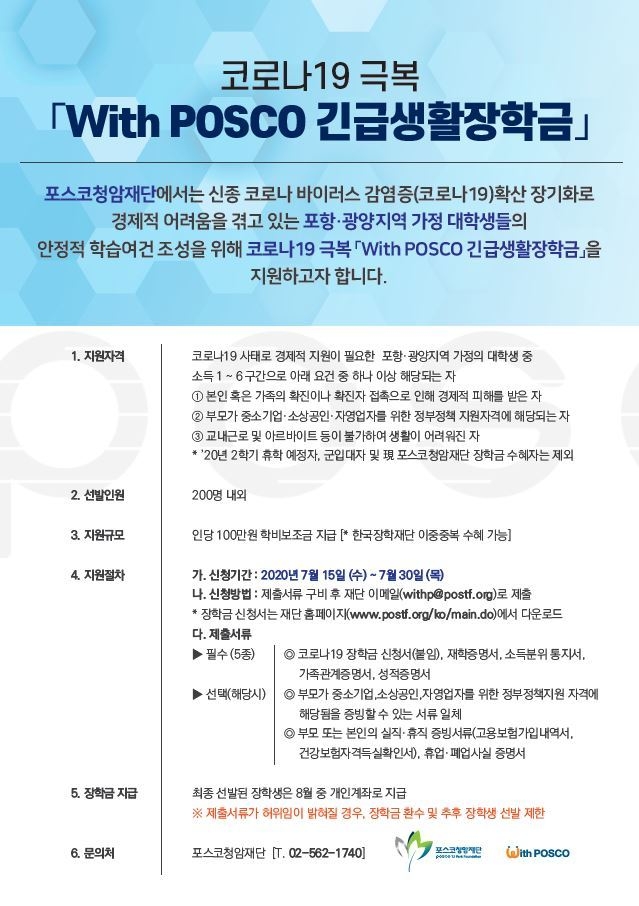 「With POSCO 긴급생활장학금」선발대상은 올해 기준중위소득 60% 이하인 포항·광양지역 가정의 대학생으로, 코로나19 사태로 인해 부모가 실직이나 폐업을 당해 가정경제가 급격히 어려워졌거나 아르바이트 일자리를 잃어 생활이 어려워진 학생이다. 선발인원은 200명 규모이며 금번 선발된 학생들은 인당 100만원의 학비보조금을 8월 중 지급받게 된다.