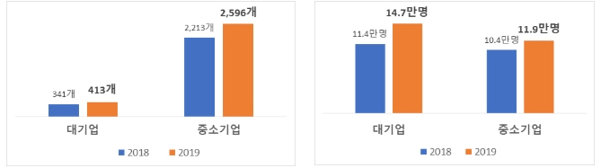 또, 한계기업 소속 종업원 수를 기업규모별로 살펴보면, 대기업은 2018년 11.4만 명에서 2019년 14.7만 명으로 3.3만 명, 29.4%가 늘어났고, 중소기업은 10.4만 명에서 11.9만 명으로 1.5만 명, 14.1%가 증가했다.