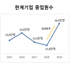 또, 한계기업에 종사하는 종업원 수는 2019년 26.6만 명으로 2018년 21.8만 명보다 4.8만 명, 22.0% 증가한 것으로 나타났다. 한계기업 소속 종업원 수는 2016년을 정점으로 감소 추세를 보이다가 2019년 한 해 만에 증가세로 전환했을 뿐만 아니라 규모도 5년 내 최고치를 기록했다.
