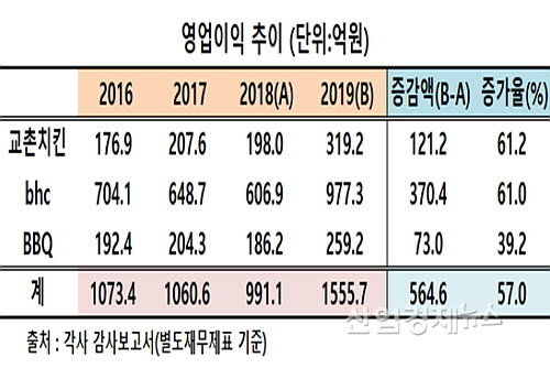 업계 1위 교촌치킨이 지난해 319.2억 원의 영업이익을 시현 2018년 대비 61.2% 가량 급증해 2위 bhc치킨의 61.0%를 0.2%포인트 앞서며 3사 중 톱을 기록했다. 이로써 외형 증가율(11.7%)에서 bhc치킨(34.1%)에게 크게 뒤처지는 성적을 시현함으로써 구겨졌던 자존심을 다소나마 회복했다.