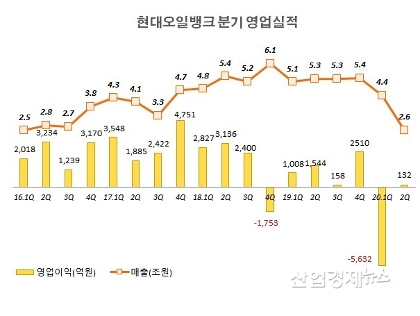 현대오일뱅크는 지난 30일 2분기 연결 실적을 발표했다. 매출은 2조 5517억원, 영업이익은 132억원을 기록했다. 정유회사로서 영업이익 132억원은 매우 작은 실적이지만 지난 1분기 5632억원의 영업손실을 냈던 것과 비교하면 이익이 큰 폭으로 증가한 모습이다.