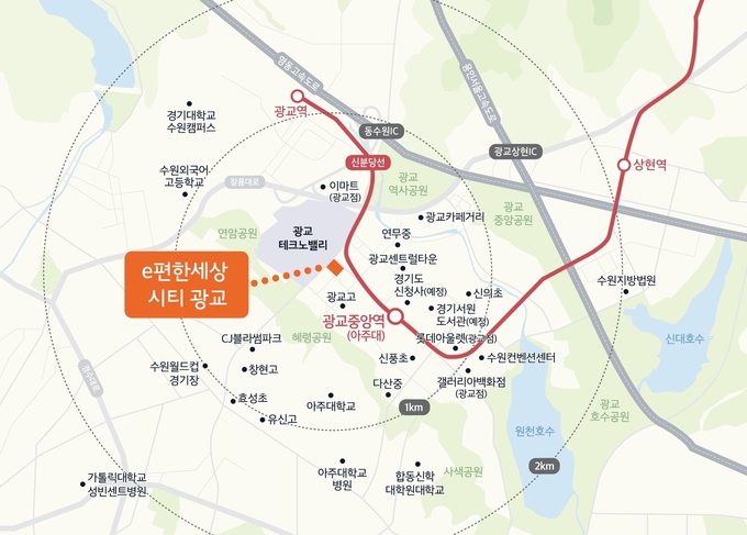 e편한세상 시티 광교가 들어서는 광교신도시는 약 342만평 규모에 산업단지와 상업, 주거, 행정이 어우러진 친환경 자족형 신도시다. 크게 웰빙타운, 센트럴타운, 에듀타운으로 나뉘는데, 센트럴타운 내에는 법조타운과 수원컨벤션센터, 경기융합타운(예정) 등이 자리잡고 있다. e편한세상 시티 광교는 핵심 입지인 센트럴타운에 위치하고 있어 풍부한 배후수요를 확보할 수 있다.