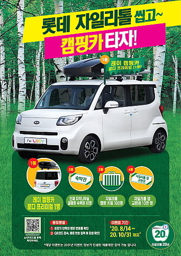 올해 출시된 ‘레이 로디 프리미엄’은 국내 첫 경차 캠핑카로 차안에 TV, 싱크대, 테이블 및 무시동 히터 등이 구비돼 있다. 2등(10명) 경품은 인제 자작나무숲 글램핑 숙박권이며, 3등(100명)은 원터치 텐트 등 캠핑 용품 3종이 들어있는 자일리톨 캠핑키트다.