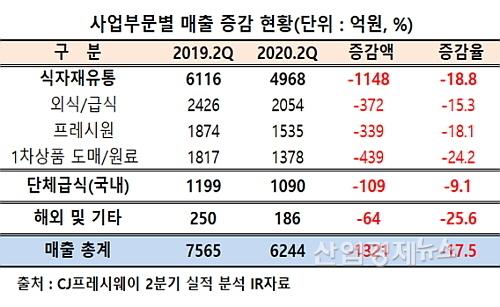 CJ프레시웨이가 지난 14일 공시한 반기보고서에 따르면 연결재무제표기준 올 2분기 매출은 6245억 원으로 전년 동기 7565억 대비 약 1320억이 줄어 17.5% 가량 역 신장했다.