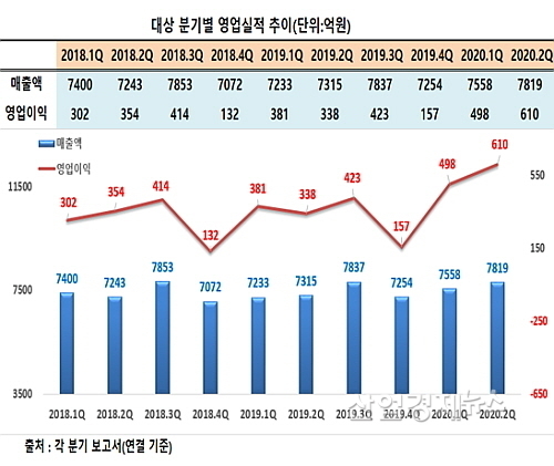 매출 역시 지난해 2분기 7315억 보다 약 6.9% 늘어난 7819억 원을 시현, 역대 최고치인 2018년 3분기의 7853억에는 약 34억이 모자라 다소 아쉬움을 남겼다. 그럼에도 불구하고 손익만큼은 1분기에 이어 창사 최대치를 또 갈아치움으로써 ‘알찬 장사’를 펼쳤다는 평가다.