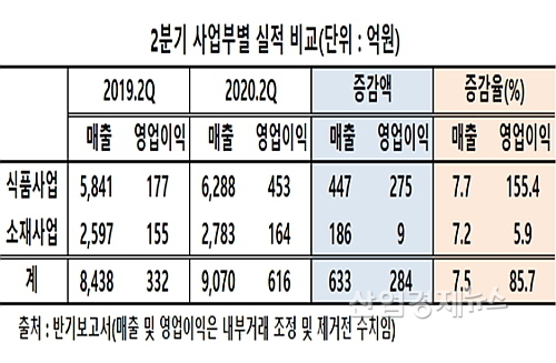 이를 양대 사업부별로 살펴보면 식품사업은 2분기에 ‘내부거래 조정 및 제거 전’ 기준 6288억 원의 매출을 올려 전년 동기 5841억 대비 약 447억 원이 늘어, 올 2분기 전사 매출이 7315억 원에서 7819억으로 약 504억 증가하는데 크게 기여했다.
