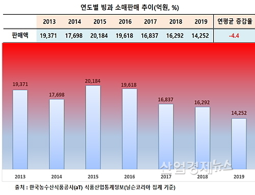 한국농수산식품유통공사(aT) 식품산업통계(aTFIS)에 따르면 소매점 판매 기준 지난해 국내 빙과시장 규모는 1조4252억 원으로 2018년 1조6292억 대비 2040억이 줄어 12.5%나 급감했다.
