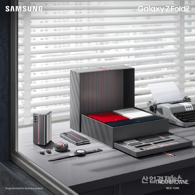 '갤럭시 Z 폴드2 톰브라운 에디션'은 톰브라운의 시그니처 회색 색상에 브랜드 고유의 빨간색, 흰색, 파란색 패턴을 섬유 소재로 입체적으로 적용했다.