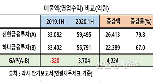 각사 반기보고서에 따르면 별도재무제표 기준 매출(영업수익)은 신한금융투자가 지난해 상반기 3조3082억 대비 79.8%나 급증한 5조9495억 원을 시현한 반면에 하나금융투자는 약 67.0% 늘어난 5조5791억의 매출에 그쳐, 외형 증가율에서 약 12.8%포인트 뒤졌다.