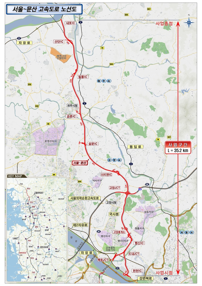 공사 관계자는 “파주시 문산읍 내포리∼고양시 덕양구 강매동 35.2㎞를 왕복 2∼6차로로 잇는 서울∼문산 고속도로 공사의 공정률이 96%를 넘어 예정대로 올해 11월 개통 준비를 완료할 예정”이라고 밝혔다.