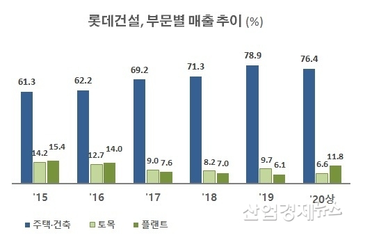 롯데건설의 주택건축 사업부문은 2015년까지만해도 전체 매출에서 61.3%를 차지하고 있었지만, 주택 호황이 계속되면서 2018년에는 71.3%로 70%를 넘기 시작했고 지난해에는 78.9%로 80%에 육박했다.