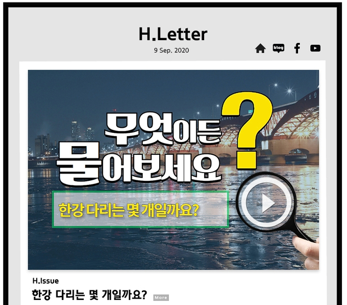 한편, 현대건설은 'H.Letter'라는 잡지 형식을 담은 유튜브 채널을 통해 회사 홍보 뿐만 아니라 건설과 관련해서 고객들이 흥미있어 할 지식과 정보를 제공한다. 최근 발행한 소식지에는 한강의 교량 수와 관련 내용을 소개했고 미래사회 트렌드를 짚어 본 로봇과 관련한 내용도 담았다.