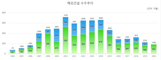한국 건설의 해외사업은 2010년~2014년까지 연간 600~700억 달러의 수주실적을 올리며 건설사 실적의 주요 역할을 했지만 최근에는 200~300억 달러로 감소해 업계의 근심이 커지는 상황이다.