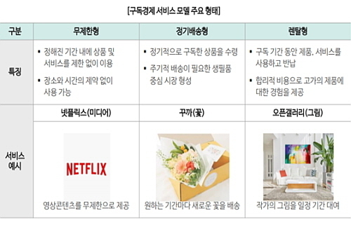 한국농수산식품유통공사(aT)에 따르면 최근 구독경제서비스 모델의 주요 형태로 3가지를 제시하고 있는데, '무제한형'과 '정기배송형' 그리고 '렌탈형'이 그 주인공이다. 아직까지는 렌탈형이 역사로나 규모면에서 시장을 선도하고 있는 상황이다.