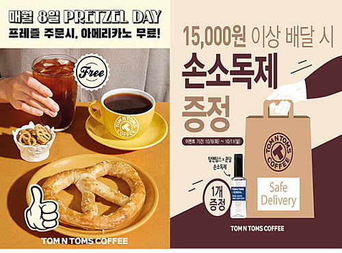 또 탐앤탐스는 오는 11일까지 ‘탐탐이 왔어요! TOM N TOMS Safety Delivery’ 이벤트를 마련, 공식 앱인 마이탐으로 딜리버리나, 스마트 드라이브스루 서비스를 이용하거나 배달앱 배달의민족을 통해 1만 5천원 이상 구매 고객에게 탐앤탐스X쿤달 손소독제 1개를 증정한다.