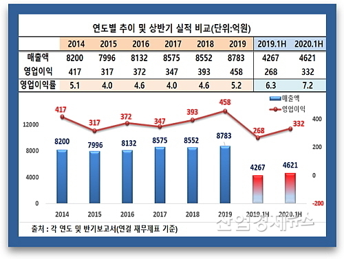 이 같은 호조세는 올 상반기에도 이어져 매출은 지난해 상반기 4267억 보다 약 8.3% 증가한 4621억, 영업이익은 전년 동기 268.3억 대비 23.6%나 급증한 331.5억 원을 시현하는 선전을 펼쳤다.