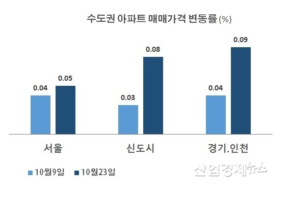 두 주 전만해도 0.03% 상승률을 보이며 서울보다 잠잠했던 신도시 아파트가격이 10월 셋째 주 0.08%까지 상승세가 가파라졌다. 경기인천 아파트가격 상승률은 신도시보다 높은 0.09%로 조사됐다.