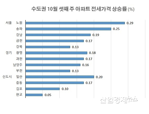 매매가격보다 높은 상승률을 보이고 있는 전세가격 상승률은, 노원구가 0.29%로 매매가격과 함께 전세가격도 수도권에서 가장 높은 상승률을 보였다. 성북역신도브래뉴, 경남아너스빌, 상계벽산이 250~2,000만원까지 오른 것으로 조사됐다.