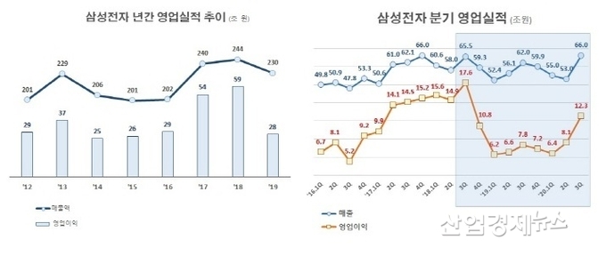 하지만 2019년 중국반도체의 진출과 세계적 불황 등이 겹치면서 삼성전자의 매출과 수익이 크게 감소하면서 영업이익이 52.5%, 절반 이하로 감소했다.