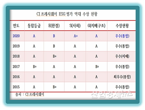 이로써 CJ프레시웨이는 2015년 처음으로 ESG평가 ‘우수기업’ 상을 수상한 이후 식품업계 최초로 6년 연속 우수기업 또는 최우수 기업에 선정되는 영예를 얻게 됐다.