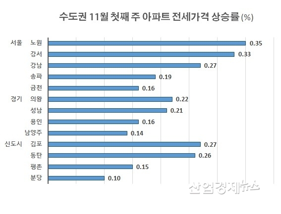 부동산114에 따르면, 이러한 상승률은 2015년 11월 첫째 주 0.21% 이후 가장 큰 상승폭이다. 서울의 매매가격 11월 첫째 주 상승률 0.06%과 비교하면 전세가격 상승률은 매매가격 상승률의 3배가 넘었다.