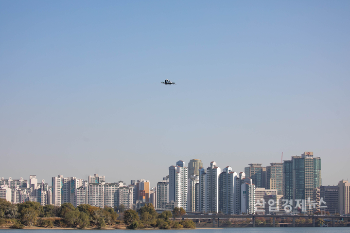 국토부는 지난 6월 한국형도심항공교통(K-UAM) 로드맵 발표 이후 이날 처음으로 UAM(도심항공교통) 서비스를 한강공원 일대에서 시연했다. 이날 시연에서는 K-드론시스템에 연동된 1대의 UAM 비행체와 6대의 드론이 안전하게 도심 상공을 비행했다.