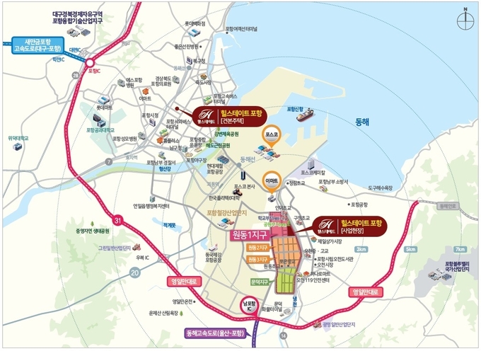 이 밖에도 포항 철강산업단지, 포항 일반산업단지를 비롯해 대규모 산업단지를 모두 10분대로 이동할 수 있으며, 600만㎡ 규모에 달하는 포항블루밸리 국가산업단지와 광명일반산업단지도 조성되고 있어 출퇴근이 편리한 직주근접의 입지적 장점도 누릴 수 있다.