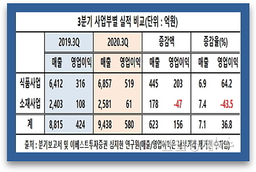 ‘내부거래 조정 및 제거 전’ 기준 소재사업 영업이익이 2019년 3분기 108억 원 대비 47억 감소한(감소율 43.5%) 61억에 그친 반면에, 식품사업부의 경우 519억을 시현, 전년 동기 316억 대비 203억 원(신장률 64.2%)이나 증가해 희비가 크게 교차했다.
