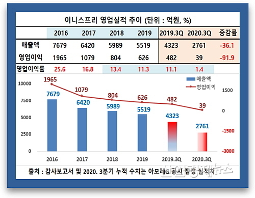 이니스프리의 3분기까지 누적 매출은 2761억 원으로 지난해 3분기 4323억 대비 36.1%나 감소했다. 손익 상황은 이보다 더 심각해, 달랑 39억 원의 누적 영업이익을 내는데 그침으로써 지난해 3분기의 482억 보다 무려 91.9%나 급감했다.